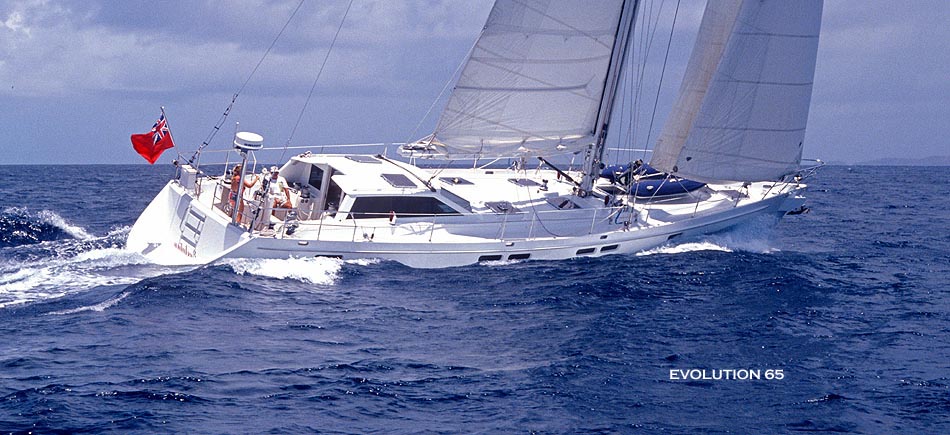 EVOLUTION was one of the early Bermuda Series yachts, built in Holland of aluminum. Her pilothouse contains a watch-stander’s berth, autopilot controls, radar and a complete navigation/ communication complex and the sail controls come to winches and line bins beneath those (what shall we call them?) porches? aft of the pilothouse. There’s a floodlight overhead in each porch to make sense of it all at night. With the autopilot steering most of the time and all of the reefing lines brought to this area through conduits, you could pretty much cross an ocean without ever donning the foul weather gear. You go outside and steer manually when it’s gorgeous, like this. She now sails out of Auckland, New Zealand.