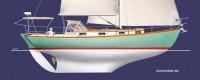 is a 24-footer that is in many ways a scaled-down FRANCES. She is a fine performer and as seaworthy as the proverbial corked bottle. She offers sitting headroom unless you are unusually long-waisted, with berths for as many as four persons. Study plans are available for US$ 25.00, Full plans without loftings or offsets for US$ 525.00 and full plans including a full-size mylar hull lofting and right to build for US$ 2250.00