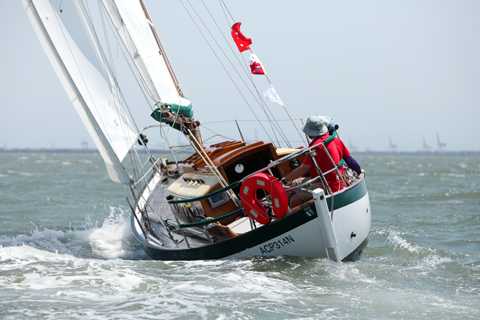 Here’s Tom Thumb– a FRANCES 26 built in Australia. Watch for an article on this, my first ever design, in the next issue of Classic Sailor in the UK. She’s going to windward really well in over 20 knots apparent- note that the mainsheet traveler has been let down to leeward so that the helm is dead on centerline. Reef a Frances when she heels twenty degrees, carry the headsail as long as you can, and she’ll chug ahead into a whole lot of wind.