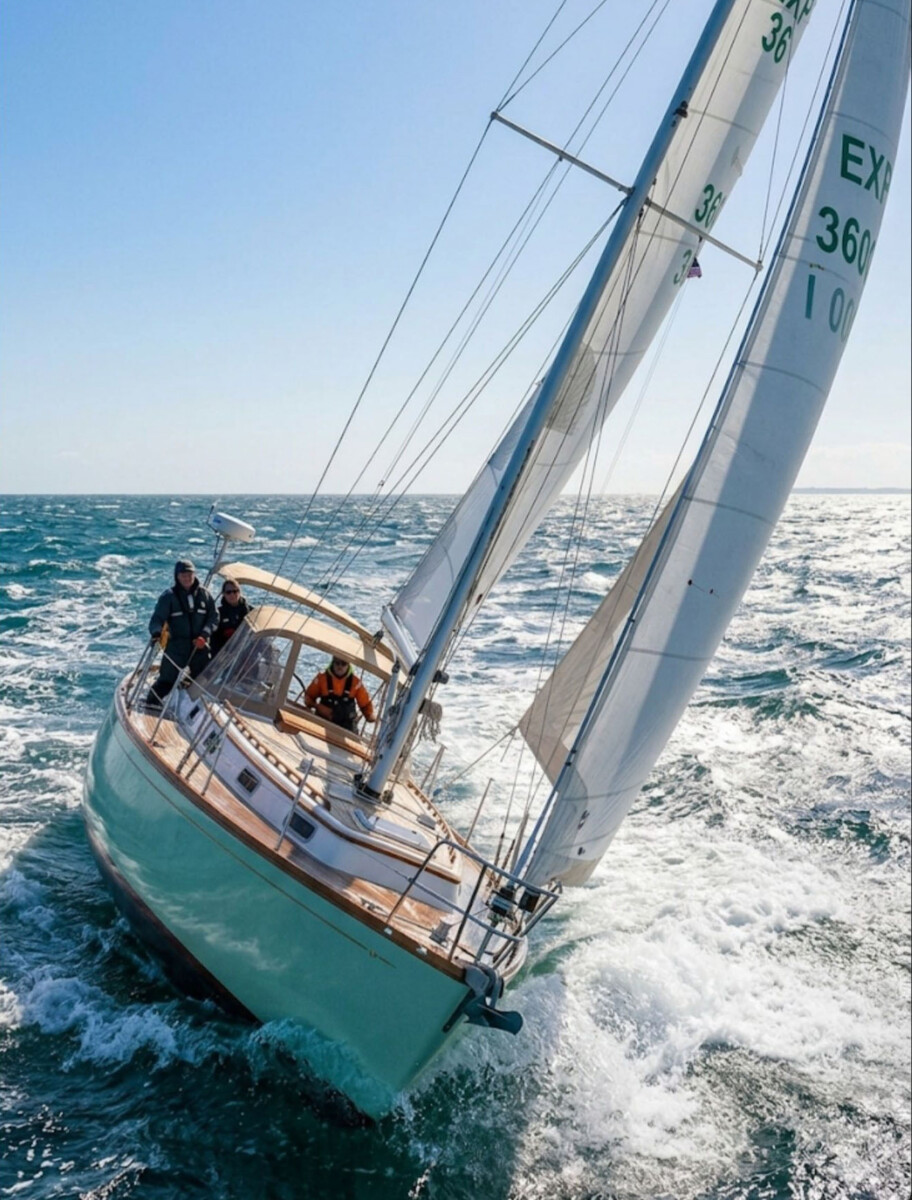 An AI generated rendering of the EXPANNIE 36. There are a few mistakes – the tiller is not shown emerging from the rudderhead and the stern metalwork/davits are not shown- but it gives a good indication of how the yacht will look. Credit: Steve Avery